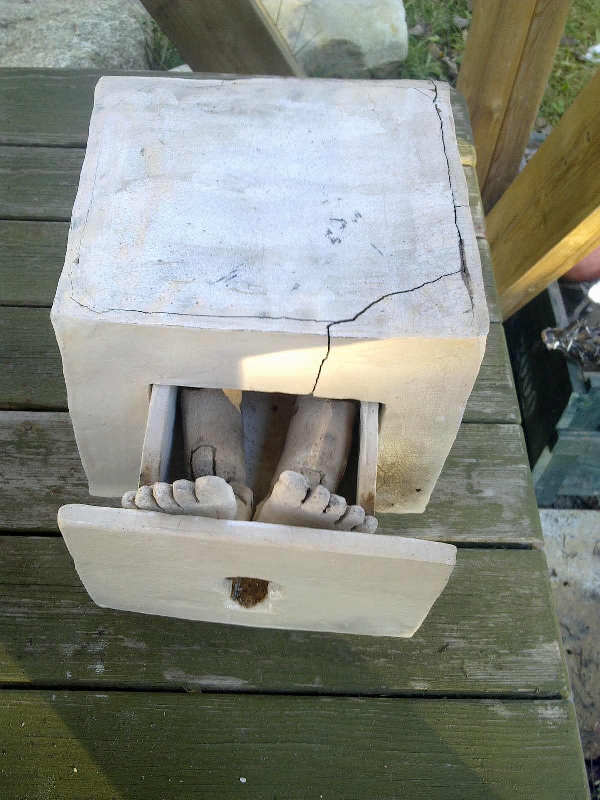 Gjorde mig en liten byrå i stengods för ett tag sedan, med en utdragbar låda. Den fick stå lite offside ett par veckor och goa till sig lite, eftersom jag vacklade lite idémässigt när den var klar, och var tveksam till om den skulle få vara kvar överhuvudtaget. för vem vill ha en liten byrå i stengods, därtill i Raku ?